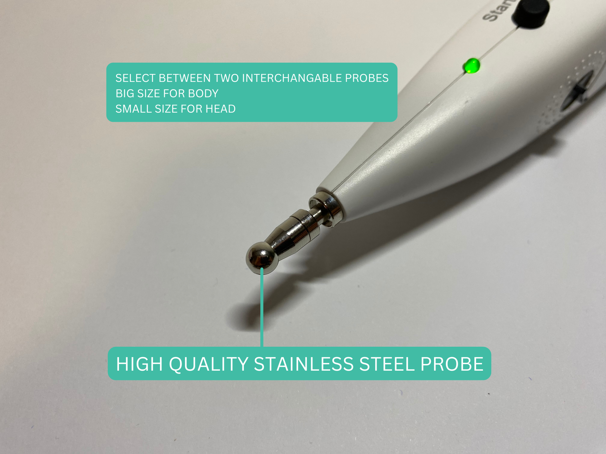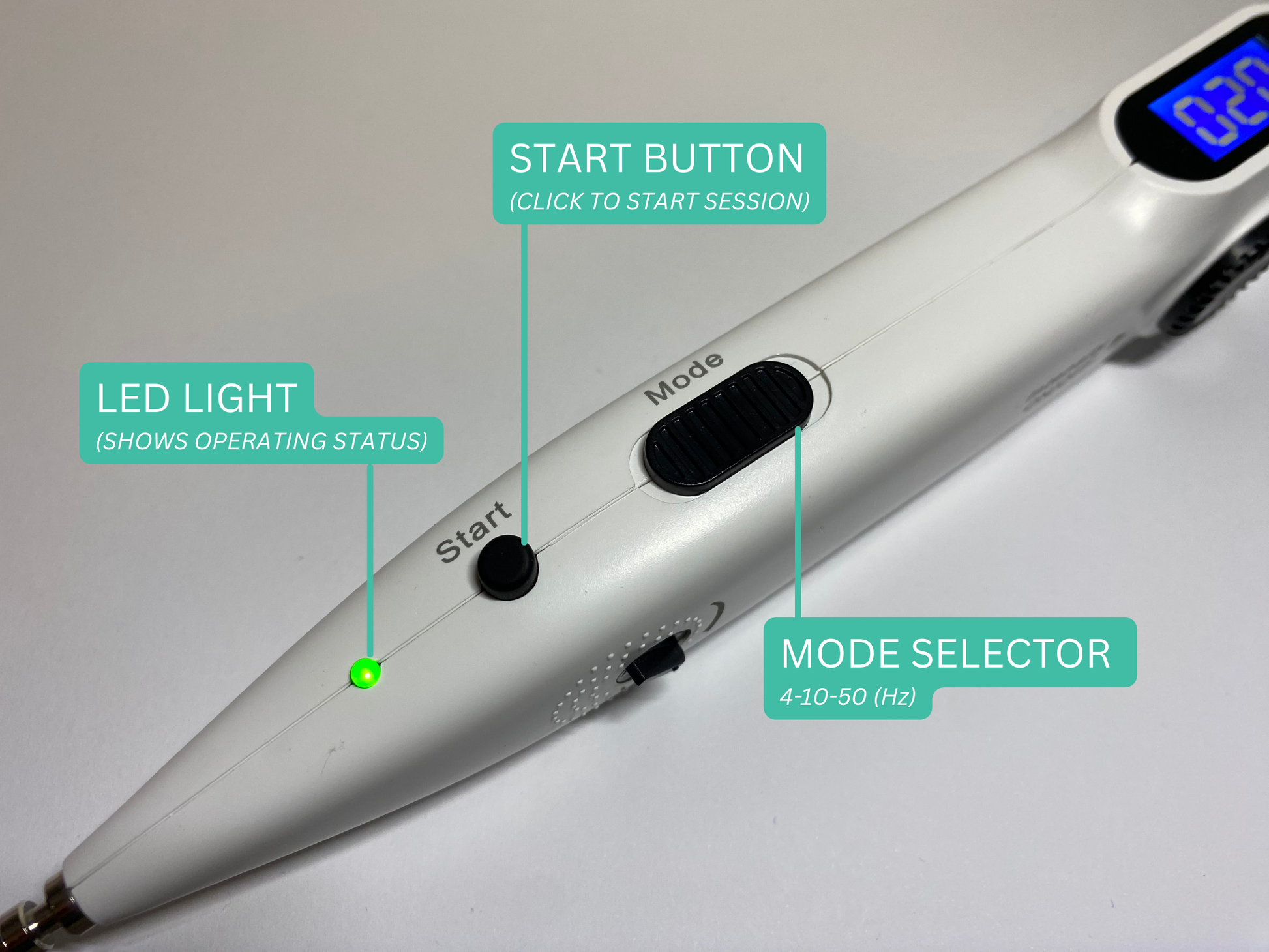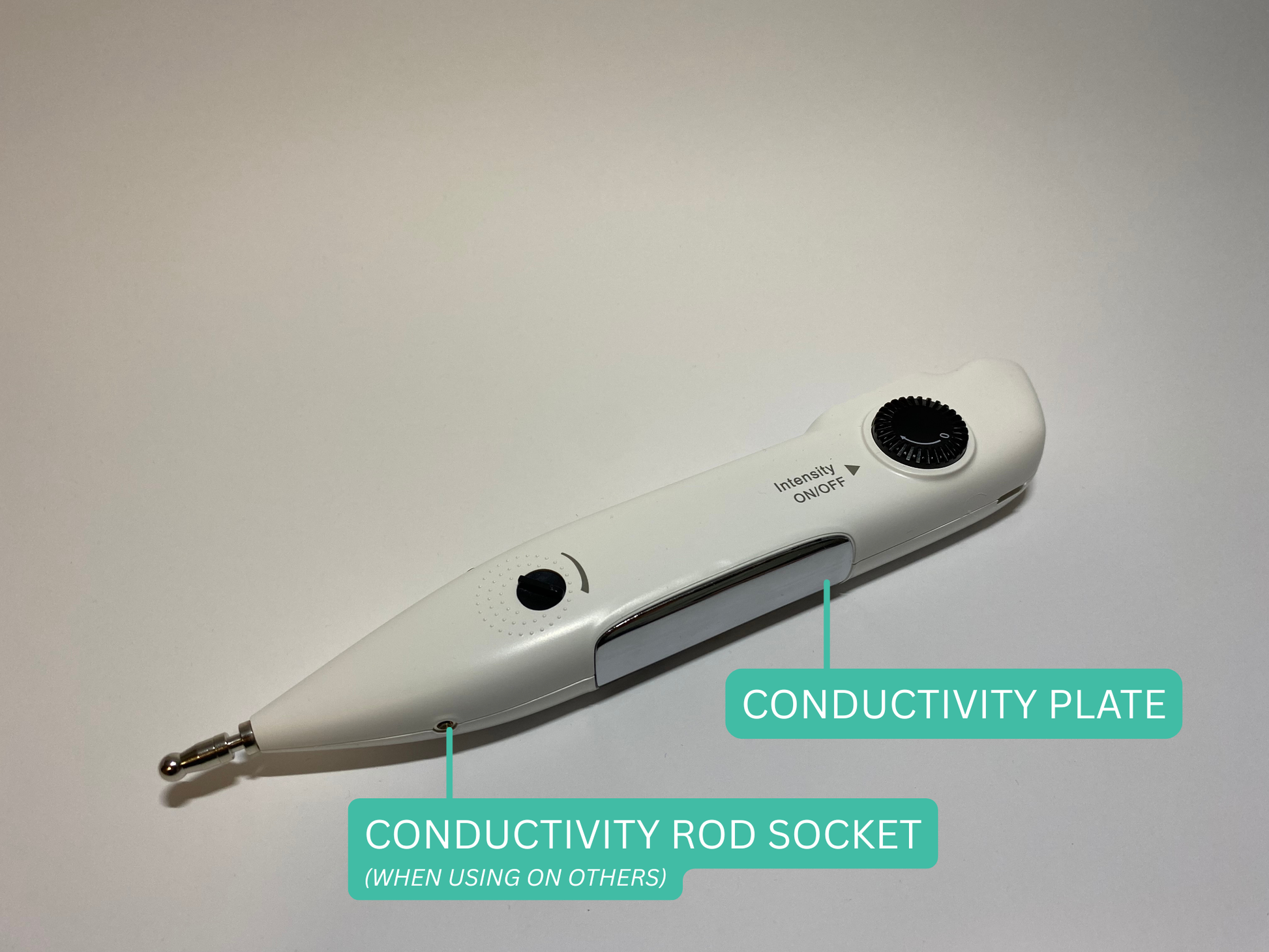 Turn on the acupressure pen using the large rotating button. Start with a low intensity and slowly increase the pulse to a level that feels comfortable.